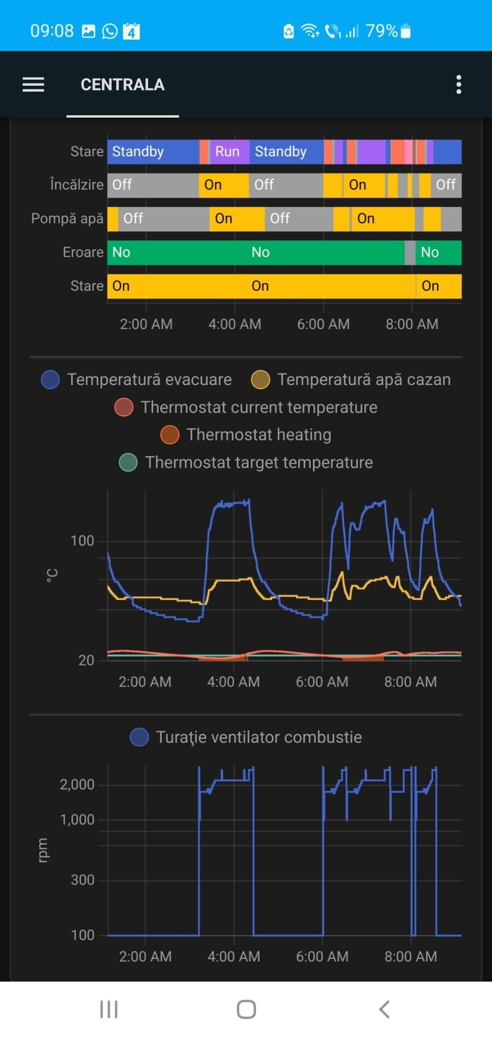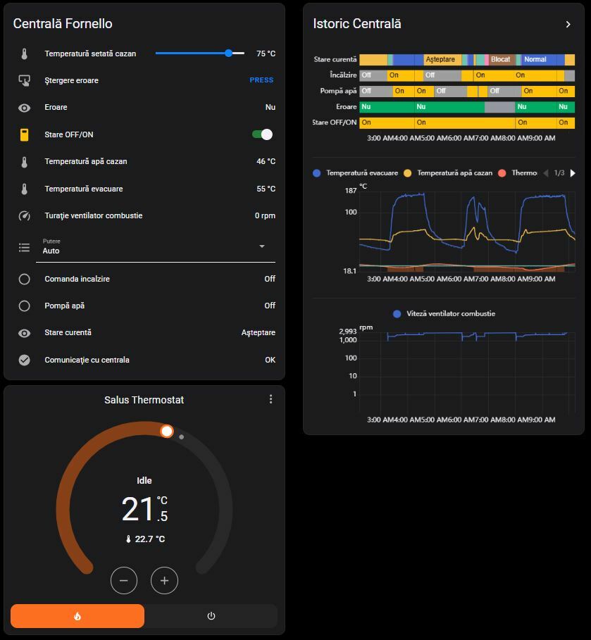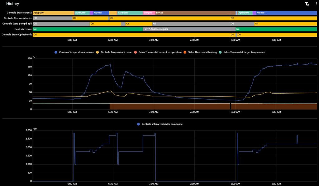 Alege perioada dorită de afișare a graficului în Home Assistant. Graficele sunt interactive (arată valori la poziționarea cursorului pe grafic) și sunt foarte utile pentru a înțelege ce condiții erau când a intrat centrala în eroare, fără bâjbâieli și presupuneri eronate.