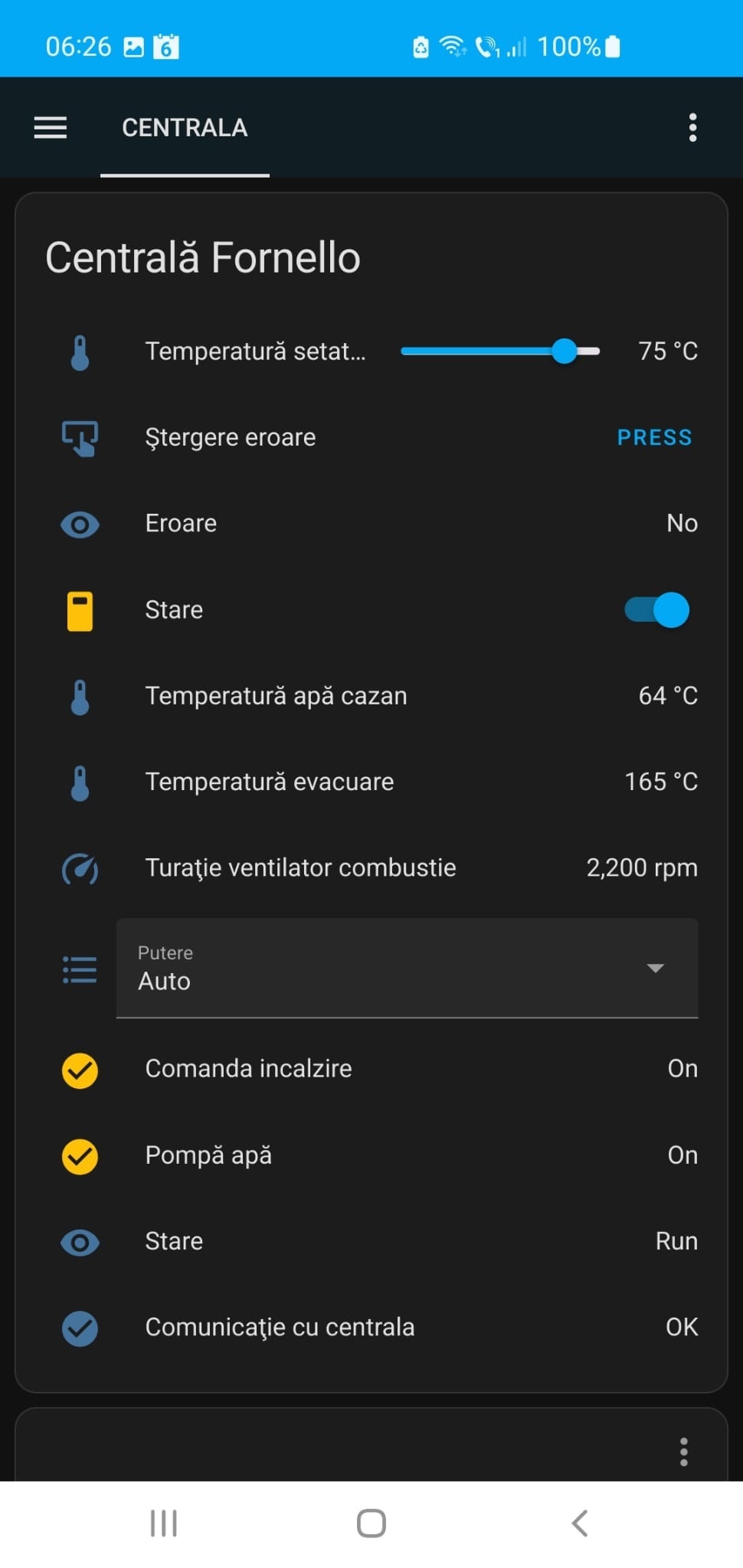 Se pot modifica parametrii de putere, se poate opri și porni centrala, se pot reseta erorile